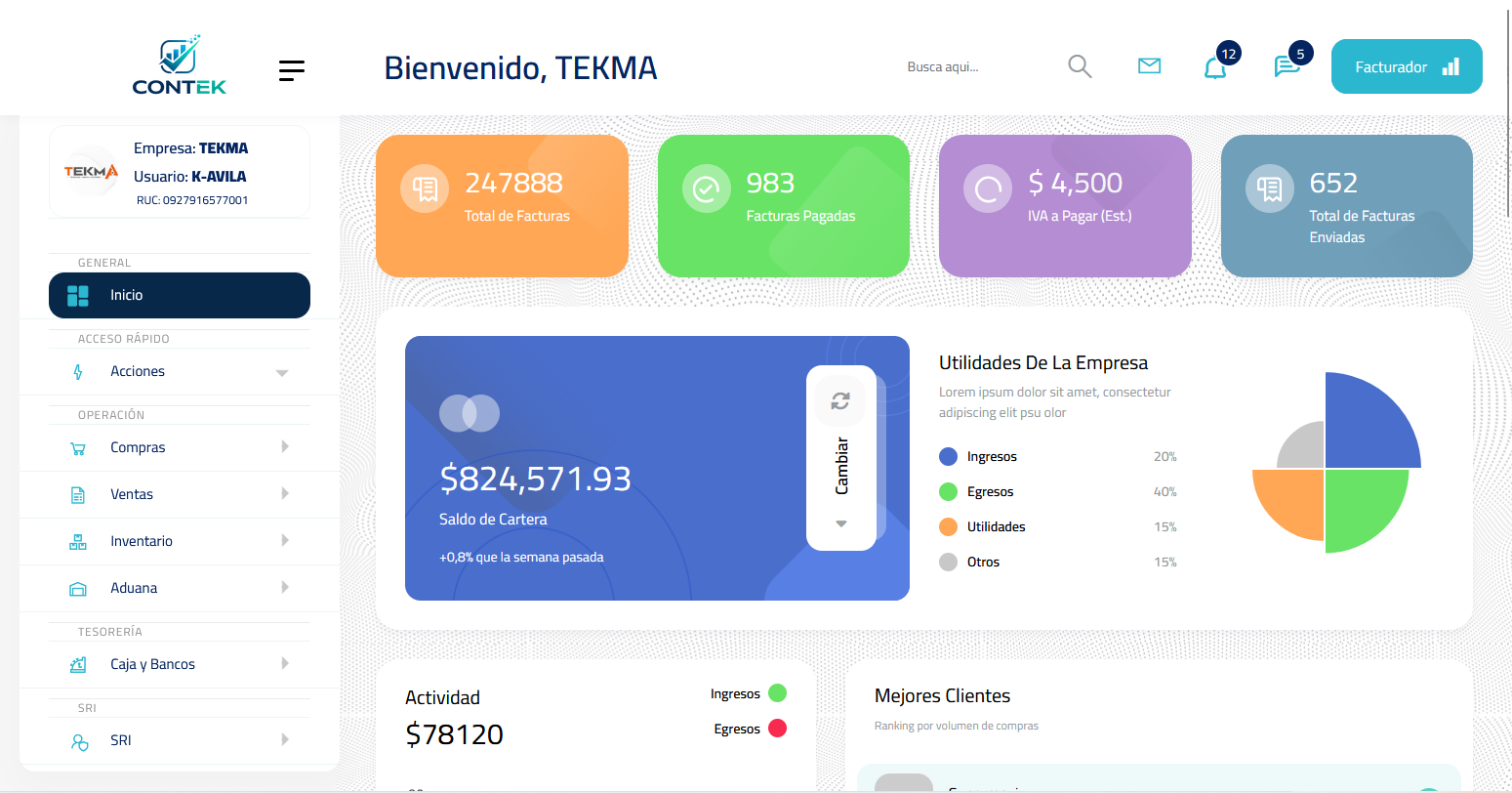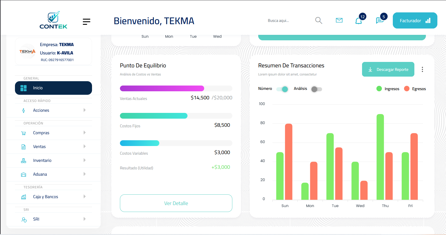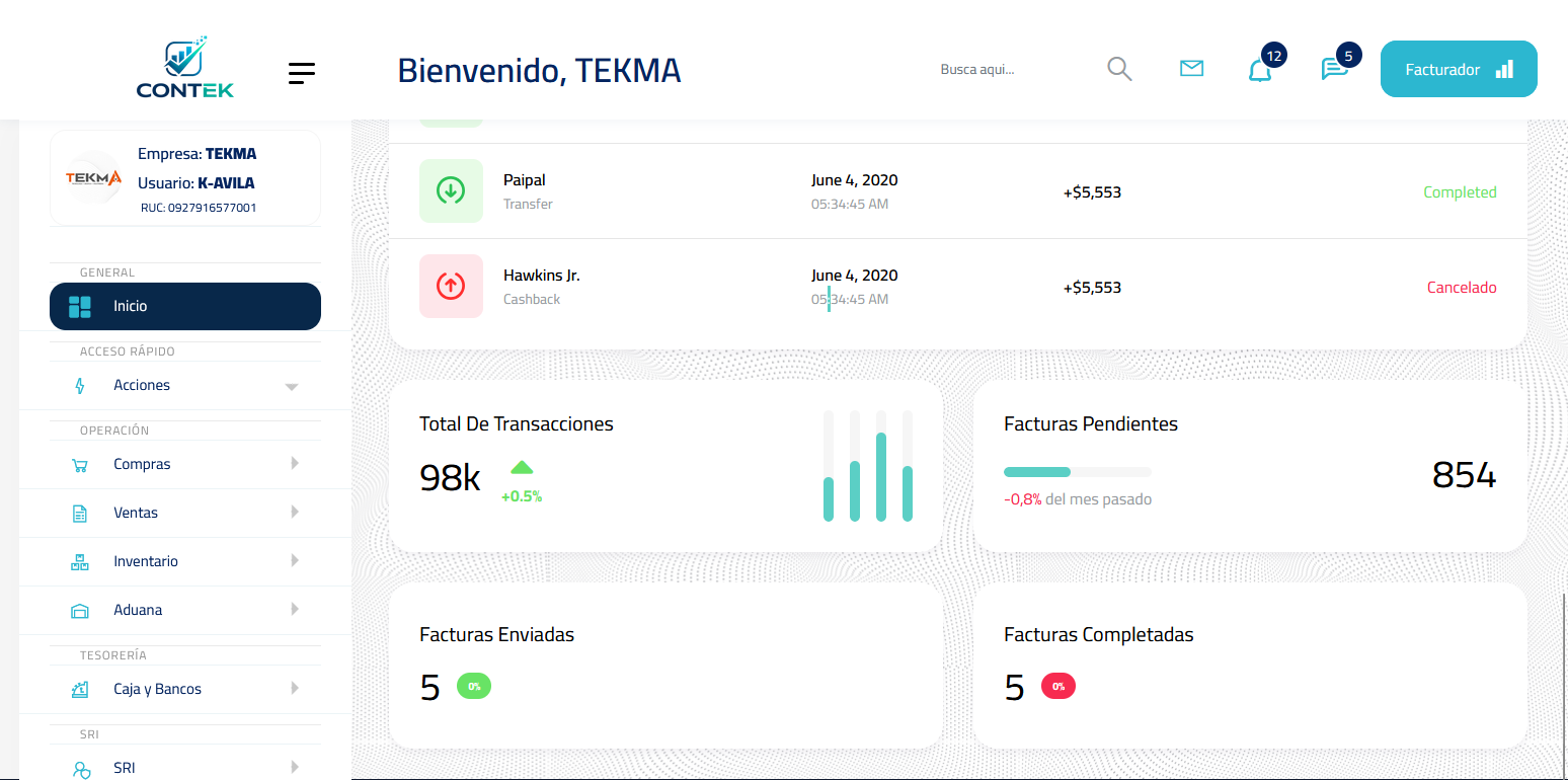 CONTEK es la solución definitiva para centralizar las ventas, compras, inventario, tesorería, nómina y cumplimiento tributario (SRI). Diseñado por TEKMA para ofrecer una plataforma web moderna, eficiente y fácil de usar.
